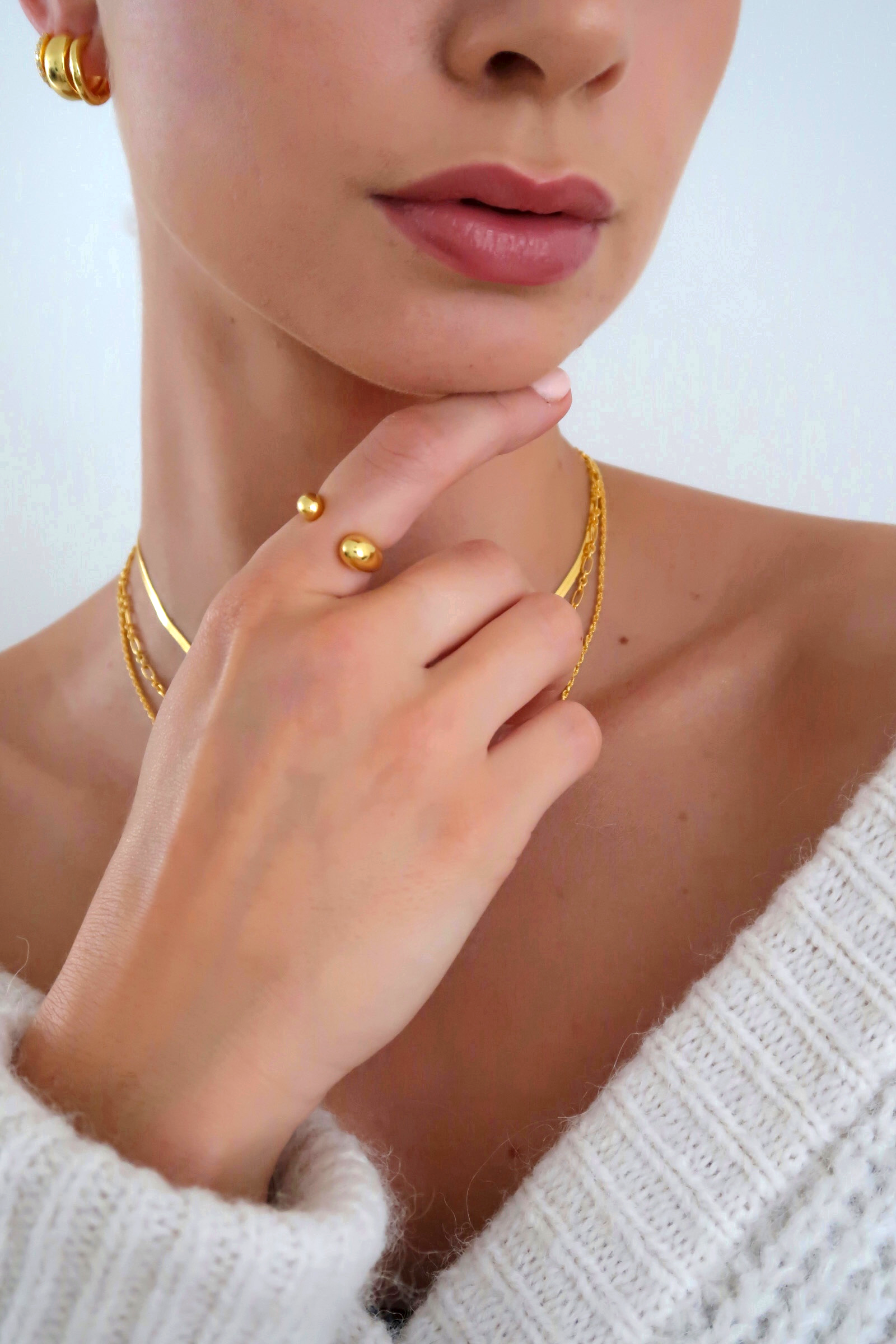De Artistic Gold Sculpt Set combineert moderne kunstzinnigheid met minimalistische luxe. De Sculptural Droplet Ring heeft een vloeiende, organische vorm, terwijl de Double Dots Ring een subtiel en speels accent toevoegt. Voor liefhebbers van unieke, eigentijdse sieraden.