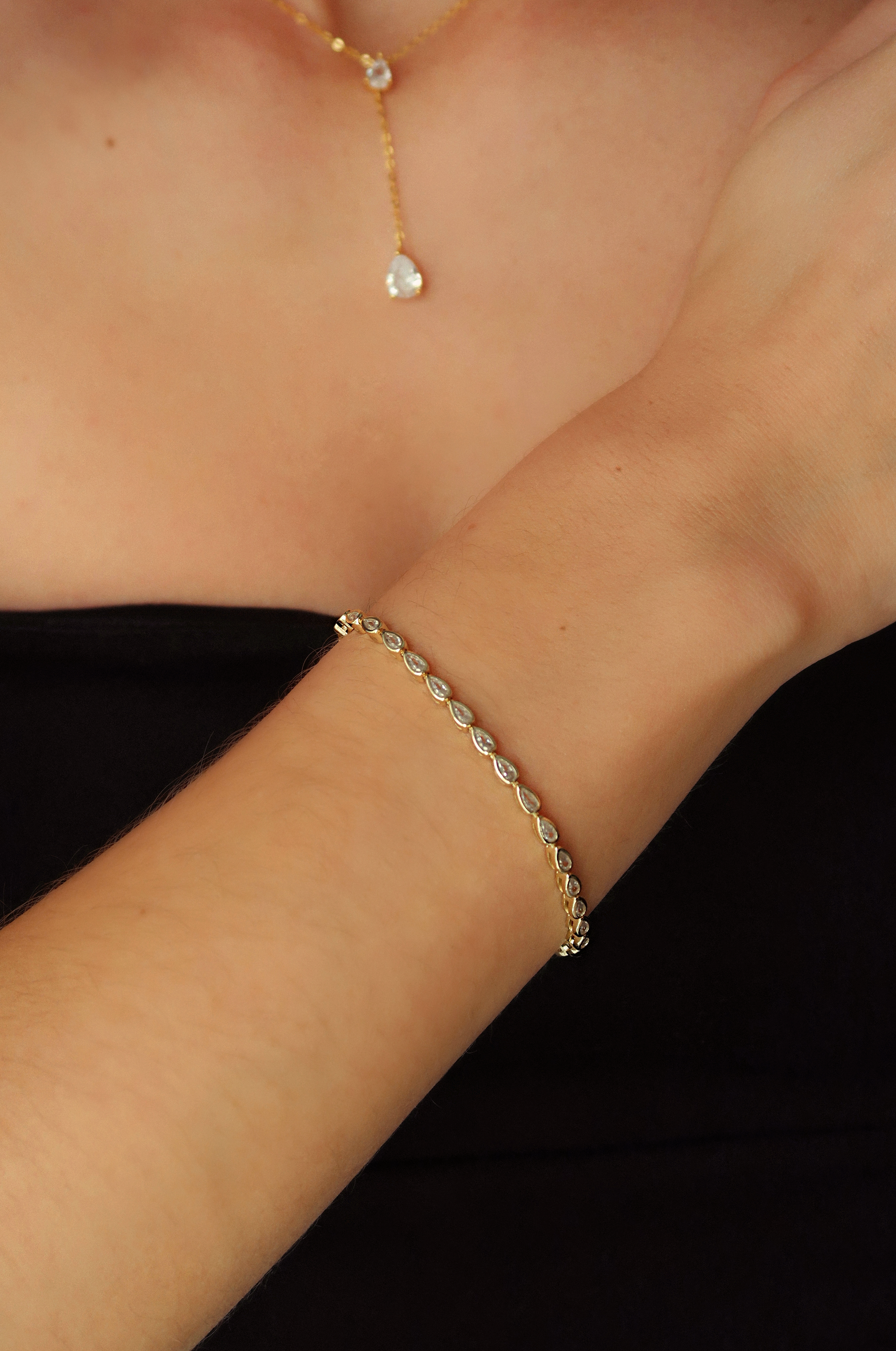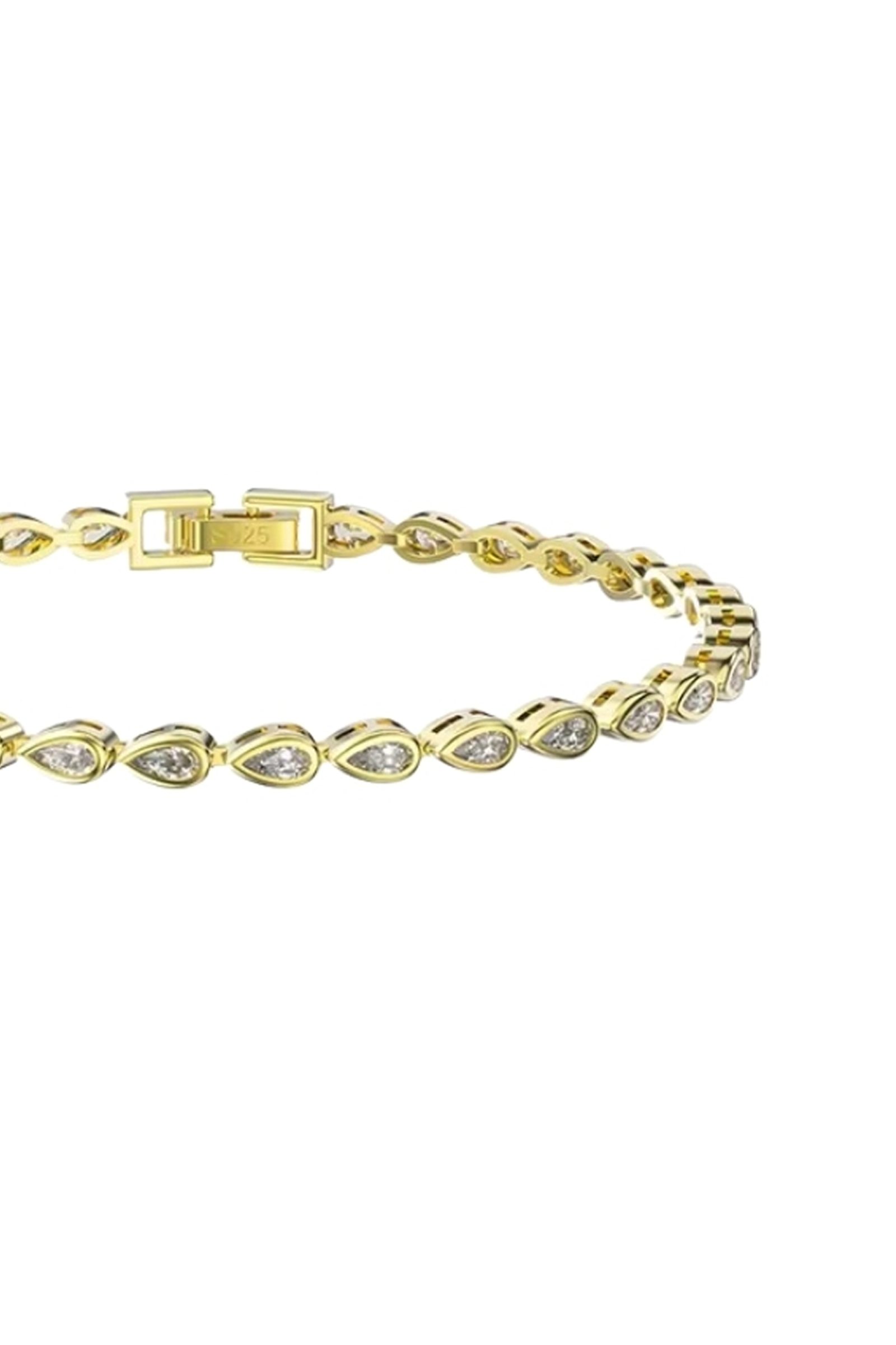 Ontworpen voor oneindige glamour. De fonkelende peer-vormige zirkoon stenen weerspiegelen het licht bij elke beweging. Met zijn chique en verfijnde uitstraling, tilt deze armband elke look naar een hoger niveau tilt.